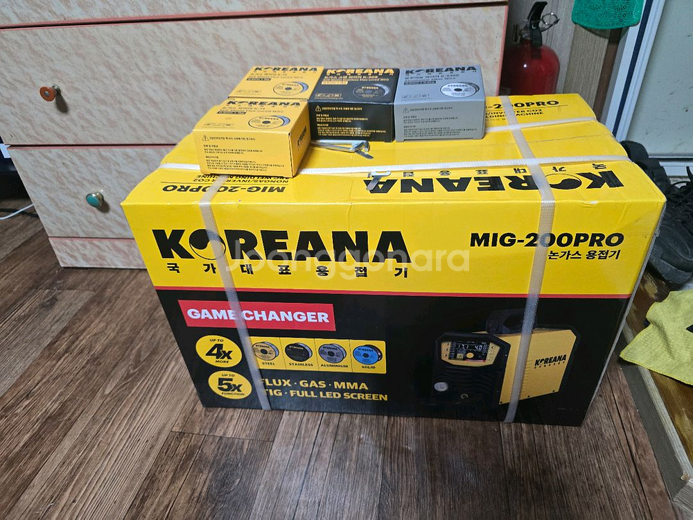 코리아나 MIG-200PRO 용접기 새제품으로 판매합니다. 박스 포장 상태 그대로 보관되어 있어서 상태 매우 좋아요. 용접 작업용으로 딱 좋은 제품입니다. - 용접기 본품 + 용접봉 : 철2개, 스텐1개, 알루미늄1개 포함. - 상태는 사진과 같음/미개봉.
