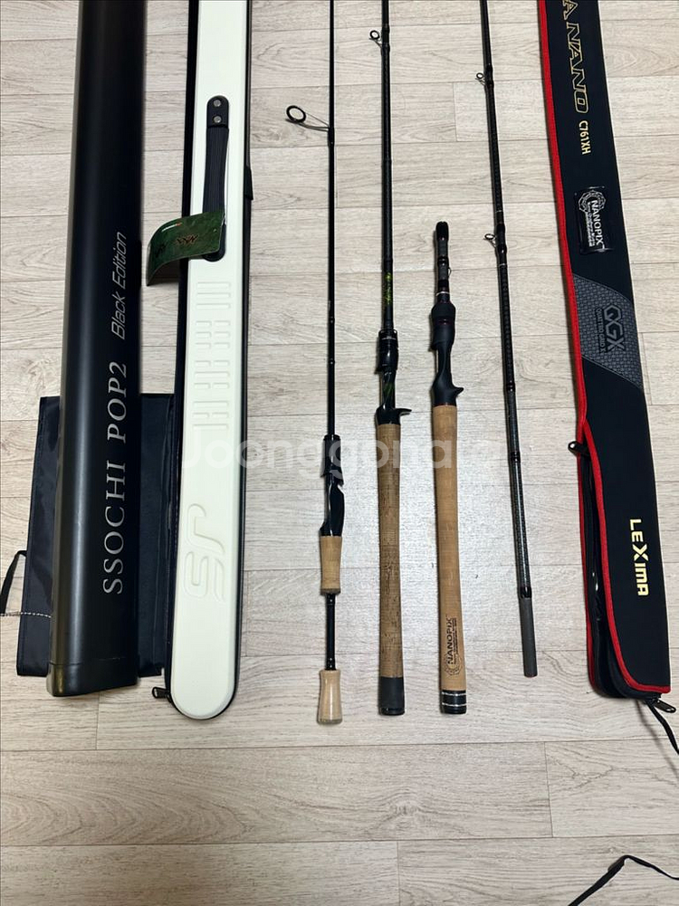 다양한 브랜드의 낚시대들이에요. 케이스도 함께 있어서 보관이나 이동할 때 편리하고, 상태는 양호해 보입니다 쏘치팝2 블랙 662L 센터컷 투피스 경품으로 받은거라 보증서 없습니다 케이스ㅇ 쏘가리용으로 나온건데 미노잉, 미드스트롤 탁월했습니다 사용감 미미하고 특이사항 없습니다 상태 제일 좋아요 - 5만 닉스팝3 732mh+ 센터컷 투피스 4-5개월 사용 코르크 손때 사용감 많습니다 쇼크나 크랙은 없구요 짱짱합니다 케이스,보증서 풀세트 범용 원태클 및 장타 웜낚에 좋습니다 - 8만 에스파다 나노 76xh. 버트컷 투피스 저번달에 신품 선물 받은후 빳빳하고 감도가 좋아 장타용으로 사용하려 했는데 다른로드가 생겨 정리 합니다. 빅베,알라바마 용으로 나온건데 감도가 좋아서 1온스급 장타로도 좋습니다 천집,보증서 풀세트 - 20만 대구 직거래 하구요 출조시 합천,고령등 약간 조율 가능 택배는 경동화물로 파손면책 동의후 노리턴 조건으로 가능합니다 택비 +1만원 에스파다 나노 지관이 있어 가능하고 나머지는 케이스로 보내야해서 반려될수도 있습니다 되독록 직접 만져보시고 구매하시는거 추천드립니다