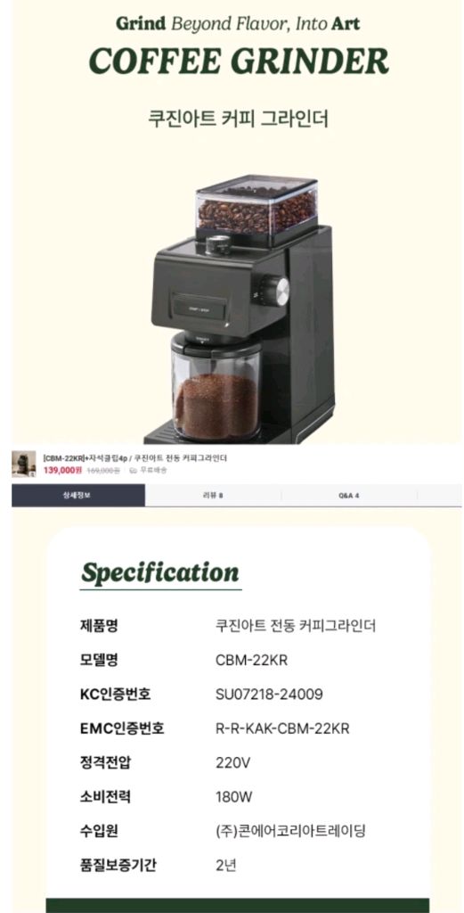 개인정보(거래정보)를 주고받는 행위는 사기에 노출될 수 있으므로 즉시 중고나라로 신고해 주세요쿠진아트 전동 커피그라인더 새제품이에요. KC인증 받은 정품으로 홈카페 하기에 완벽한 제품입니다. 깔끔한 블랙 디자인으로 어떤 주방에도 잘 어울려요. 새상품이며 바로 보내드립니다.