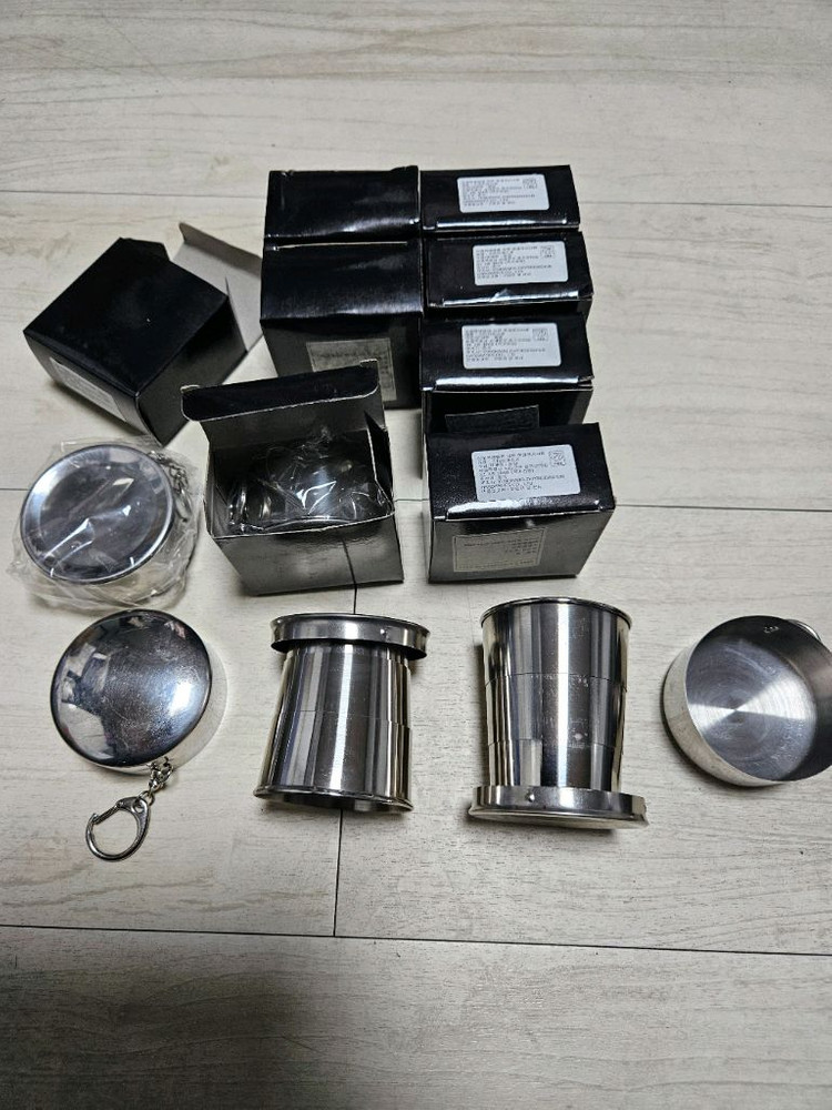 캠핑용 스테인리스 캠핑컵과 보관케이스가 포함된 세트예요. 여러 개의 캠핑컵과 전용 케이스가 함께 있어서 캠핑이나 야외활동에 유용할 것 같아요. 상태는 깨끗해 보입니다. 10개 일괄입니다