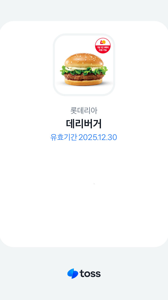 개인정보(거래정보)를 주고받는 행위는 사기에 노출될 수 있으므로 즉시 중고나라로 신고해 주세요롯데리아 데리버거 기프티콘이에요. 유효기간은 2025년 12월 30일까지입니다. 맛있는 데리버거 드시러 가세요!