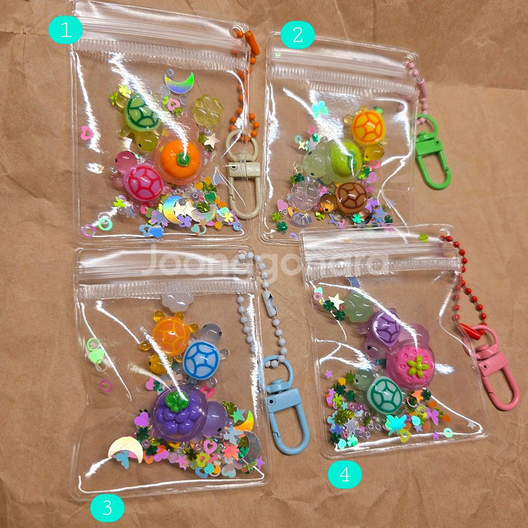 지퍼백 거북이 D고리 키링 4개. (귤/사과/포도/딸기) 개당 4천원 (반값+2천원)(일반+4천원추가) 길이 약7.5cm 가로 6cm 거북이 함께 예쁜 행운 비즈 가득 * 약하게 야광입니다~(6번째사진) * 과일거북이는 두께가있어 고정되어있고 작은비즈들이 움직여요 * 1개 이상 구매하실 분은 미리 말해주세요. 게시글의 가격수정해드려요~ 🍈 구매 전, 꼭 메세지 한 번 주시고 결제해주세요. 🤨 질문 후 장시간 대답없음 & 찔러보기는 차단합니다. 📦 반값택배시 편의점도착 후 3일이내 (반품책임X) 💸 네고문의는 답 안드려요. 올린 금액대로 판매해요. ⭐️ 최대한 빨리 답드리고 택배접수해요. ⚡️ 빠른 구매확정 부탁드립니다. 📷 사진그대로입니다. 반품안되기때문에 신중히 생각해보시고 구매문의채팅주세요😃.