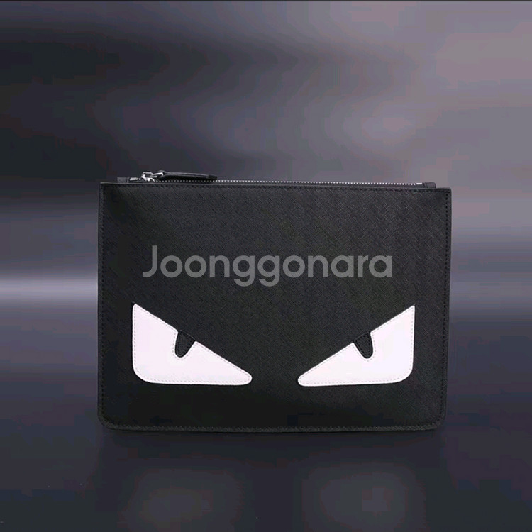 몬스터 디자인의 클러치백이에요. 블랙 베이스에 화이트, 옐로우, 레드 팬더 아이 패턴으로 구성되어 있고, 골드 지퍼와 스냅 버튼이 포인트입니다. 새제품으로 고급스러운 실용적인 아이템이에요. 사이즈 30X20 무료배송