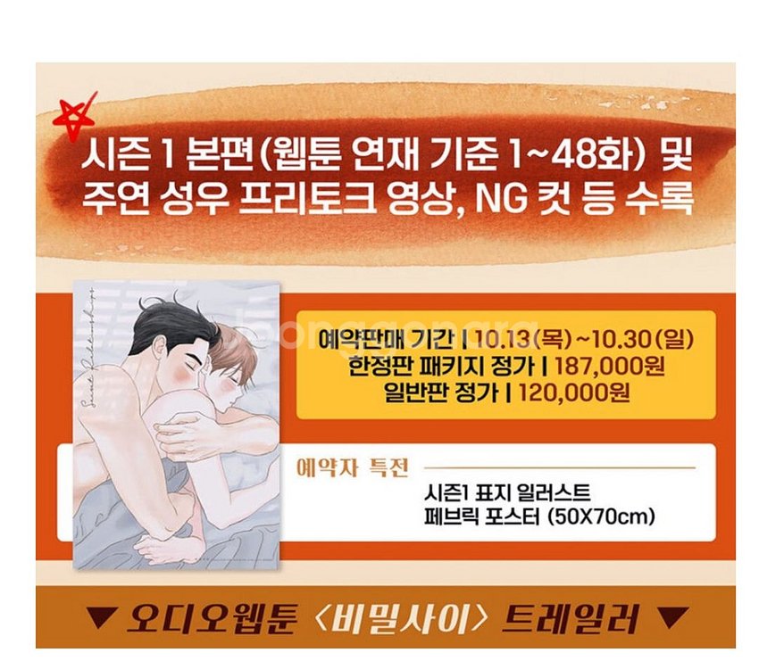 개인정보(거래정보)를 주고받는 행위는 사기에 노출될 수 있으므로 즉시 중고나라로 신고해 주세요시즌1 오디오웹툰 비닐도 뜯지않은 상태로 보관중이에요. 서점별 특전으로는 패브릭 포스터 있습니다. 저도 안 뜯어봐서 얼마나 큰진 모르겠네요. 실물사진은 연락주시면 보내드려요