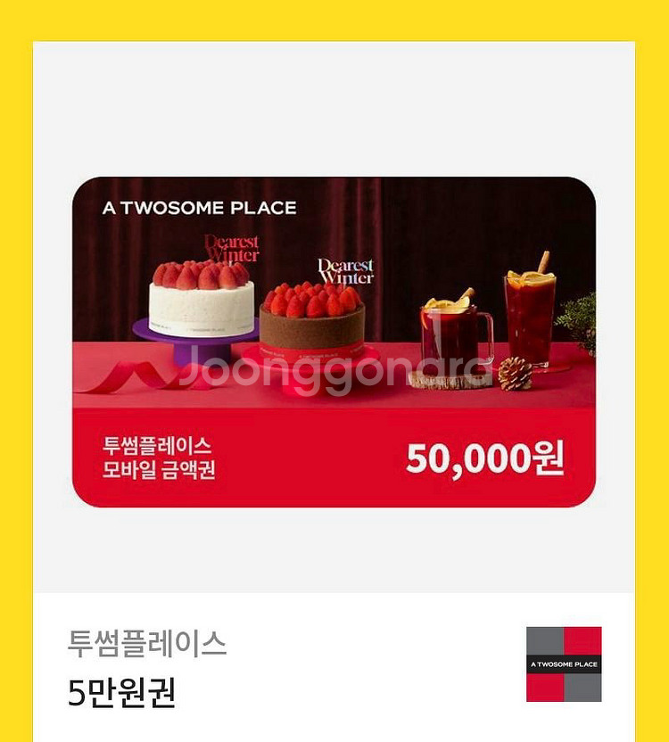 개인정보(거래정보)를 주고받는 행위는 사기에 노출될 수 있으므로 즉시 중고나라로 신고해 주세요투썸플레이스 5만원 모바일 금액권 판매해요! 유효기간 확인하시고 구매하세요. 맛있는 디저트와 음료 즐기실 수 있어요. 유효기간은 26.12.25까지 입니다