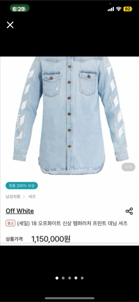오프화이트 데님 셔츠 95-100 팔 부분에 TEMPERATURE 프린팅이 있고 뒷면에는 오프화이트 특유의 사선 프린팅이 있습니다 구매 가격은 1,150,000원입니다 사용감은 있지만, 디자인이 예뻐서 충분히 활용 가능합니다