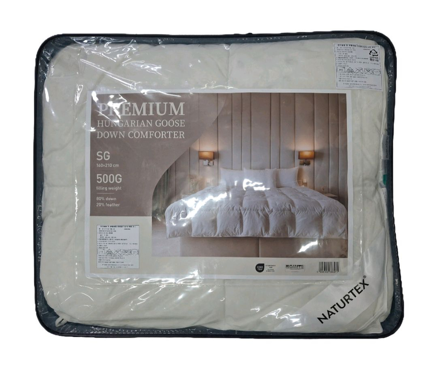 코스트코에서 판매하는 "NATURTEX 헝가리안 구스 이불-싱글"입니다. 제품 상세 사진과 스펙, 사진 참고 부탁드립니다. # 품명 NATURTEX 헝가리안 구스 이불-싱글 # 제품 특징 -OEKO-TEX 인증 -헝가리안 구스 500g -기계 세탁/건조 가능 # 제품 사양 -브랜드: 네이처택스 (Naturtex) -색상: 화이트 -사이즈: 160 x 210cm -소재: 겉감 - 면 100% / 충전재 - 솜털 80%, 깃털 20% -구성: 이불 1 택배 가능 남양주 별내 직거래 가능
