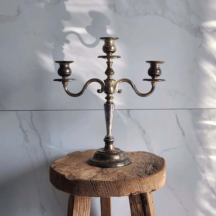 사이즈 약 높이 36.5cm 가로 31.5cm 클래식한 미국 빈티지 제품으로 묵직한 무게감이 있는 대형 캔들 홀더입니다. 중앙 기둥을 중심으로 좌우로 부드럽게 뻗은 암(arm)이 균형감 있게 이어져있어 전체적으로 우아하고 안정적인 실루엣을 보여줍니다. 각 촛대 받침은 잔 형태로 마감되어 있으며, 촛농이 흘러도 자연스럽게 받아주는 구조입니다. 촛불을 밝혔을 때 실버 톤의 은은하게 반사되는 빛이 매우 아름다우며 테이블 위의 센터피스 역할을 톡톡히 해내는 아이템입니다. 세월이 지나며 현재는 자연스러운 변색이 있는 상태이며 닦아주시면 본연의 실버 색감이 드러납니다. 구매 가격에 보냅니다. *** 빈티지 제품 특성상 사용감, 세월감 있어요. 하자 발견시 말씀드리지만 제가 발견하지 못한 하자가 있을 수 있습니다. 교환/환불 불가. 빈티지 제품 이해하는 분만 구매해주세요. ***