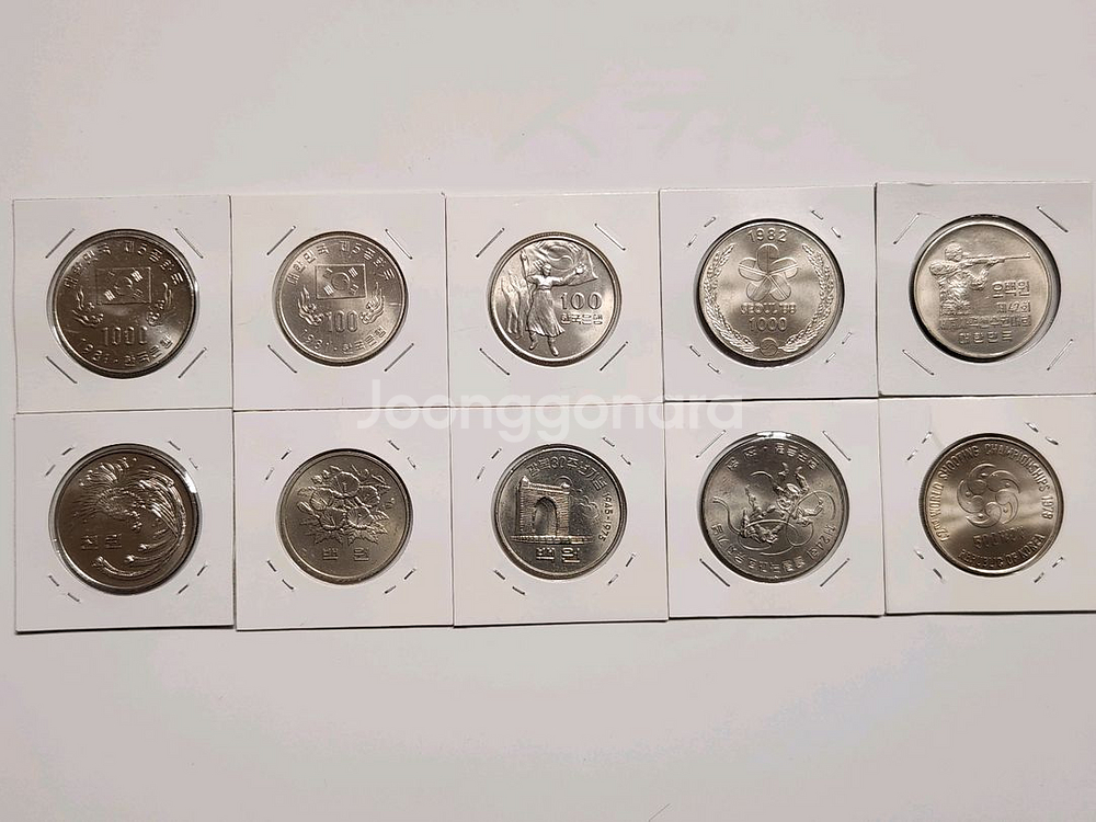 기념주화 5종 8개 세트입니다. 5공화국 천원. 5공화국 백원. 광복 30주년. 올림픽 유치기념. 세계사격선수권 대회 각각 2개힉 개별 케이스에 보관되어 있어 상태가 양호해요. 수집용이나 선물용으로 좋을 것 같습니다.