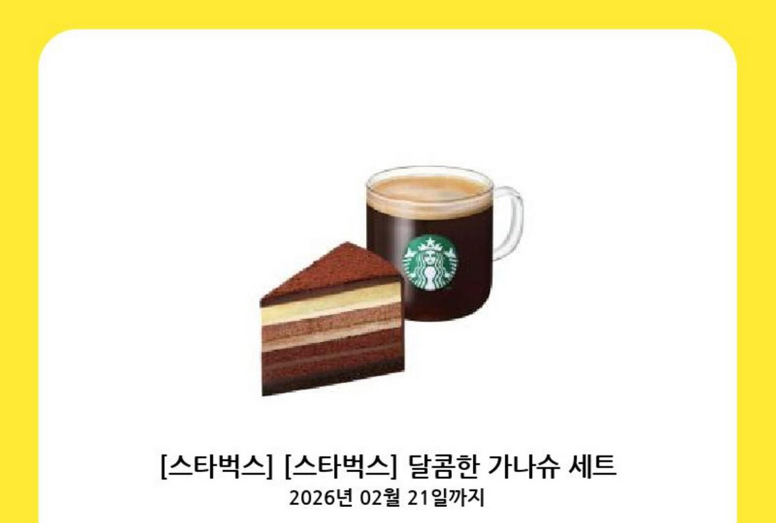 스타벅스 달콤한 가나슈와 커피가 함께 있는 세트예요. 2026년 2월 21일까지입니다. 채팅주세요