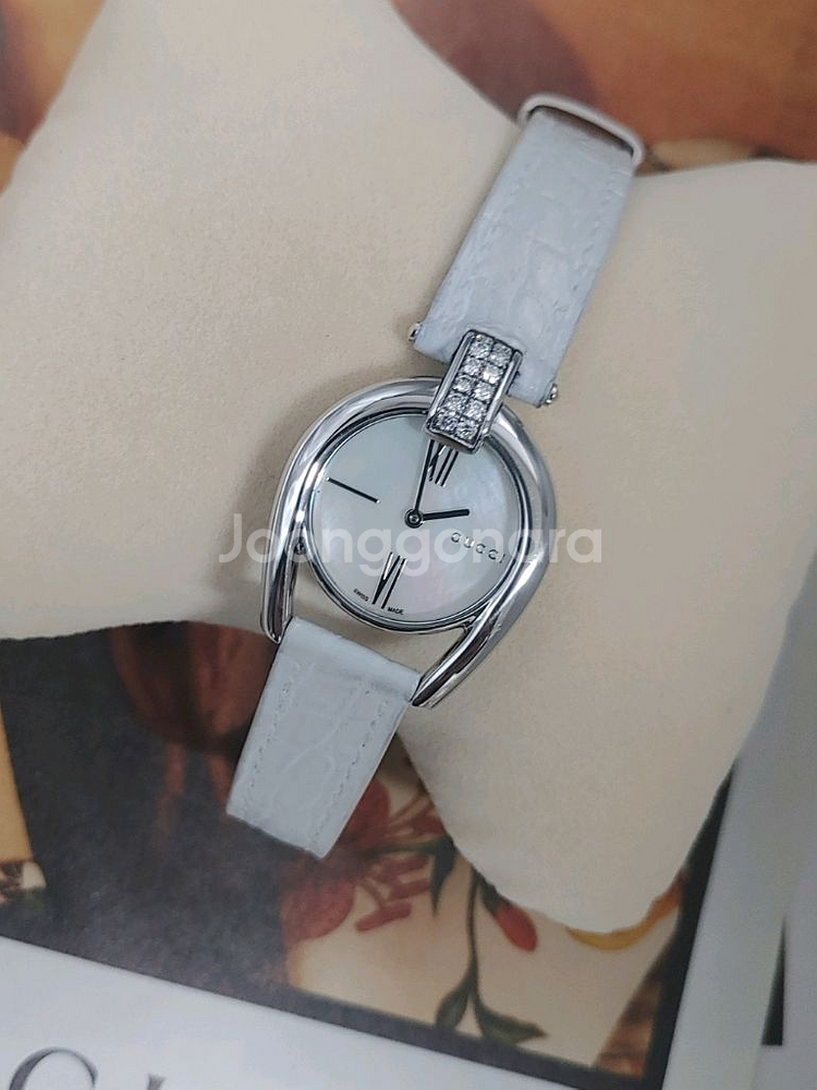*케이스크기:28m/m(넓이) *12P 다이아 *자개문자판 *swiss made 구찌 정품이며 원래 뱅글형 메탈줄 제품이나 정품 에르메스 옅은회색 가죽밴드로 교체해놓은 상태 입니다(상태좋음) 260만원대 판매되던 고급제품 입니다. 빼놓은 메탈줄과 홈을 파놓은 여분의 짙은부라운 밴드(사제품)도 함께 드립니다. (메탈줄은 여분줄없고 15센치정도임) 미세한 잔기스등 있으나 상태 아주깔끔하며 건전지는 새로 교체하였습니다. 구성품은 케이스와 쇼핑백 여분밴드등 이며 보증 개런티카드는 없습니다.