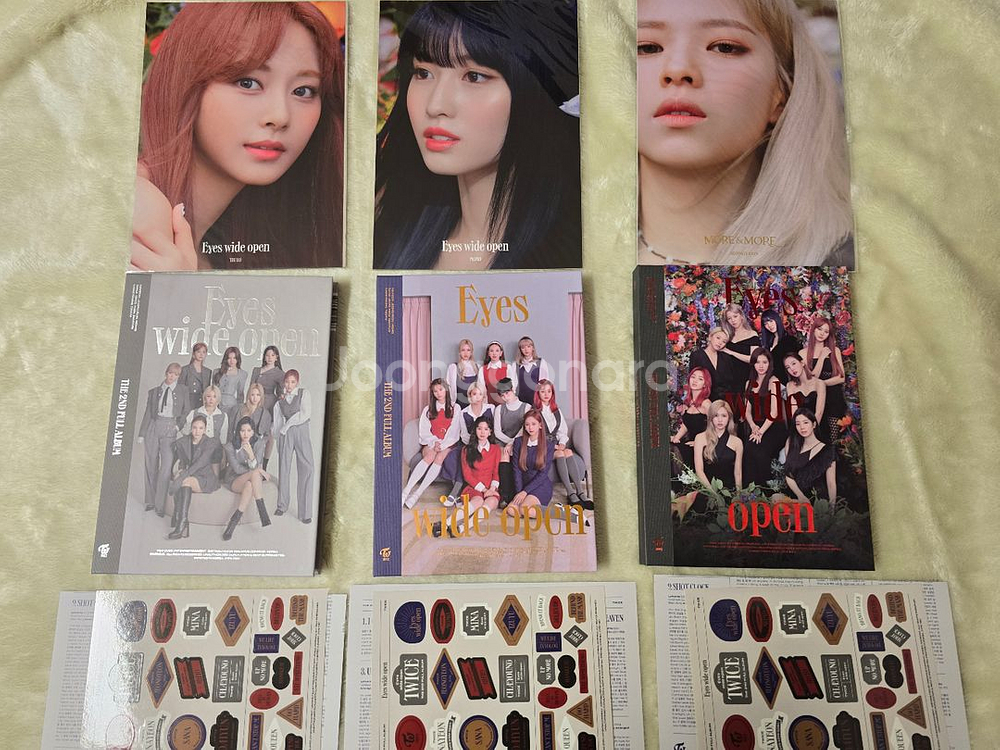 트와이스 Eyes Wide Open 단순개봉앨범 **앨범포카x** 사진상 구성품 참고해주십시오 포카만빼서 바로 보관이라 매우 깨끗합니다. 사진상 보이시는바와 같이 예판 엽서 증정합니다 사진에 보이는 모든것 3종일괄 가격입니다. 교환환불x