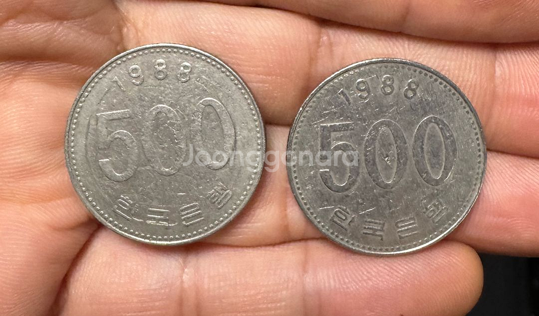 1988년 발행된 500원 동전 2개입니다. 양면에 날개 뻗는 새 모티브가 있고, 사용감은 있지만 상태 양호해요. 지역 : 대구 개당가격 : 15만원