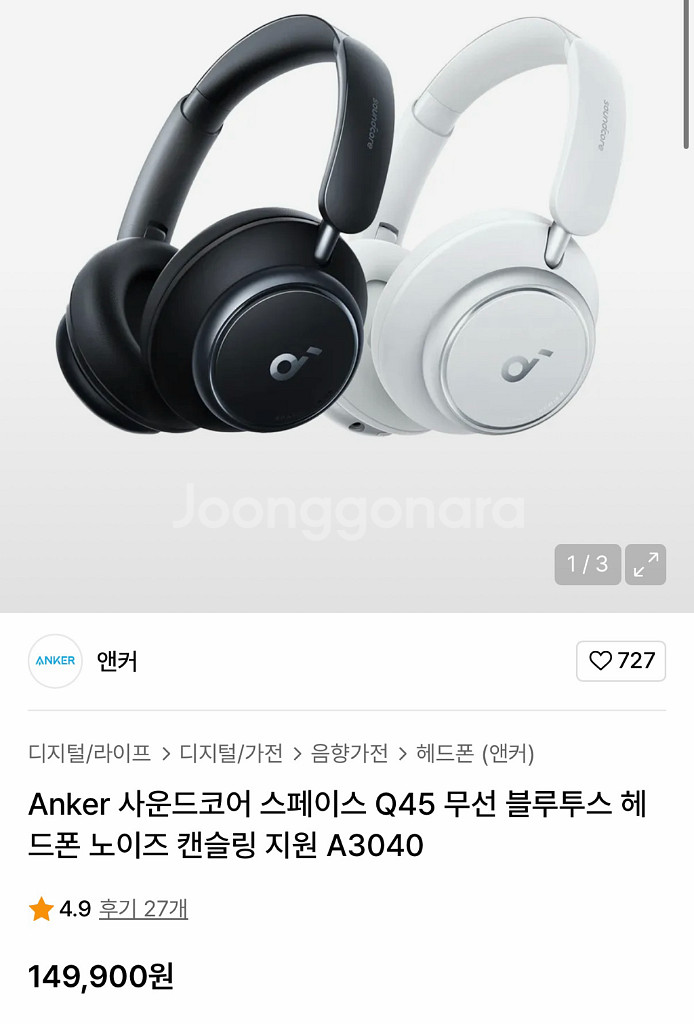 Anker 사운드코어 스페이스 Q45 무선 블루투스 헤 드폰 노이즈 캔슬링 지원 A3040 착용 10번 정도 입니다