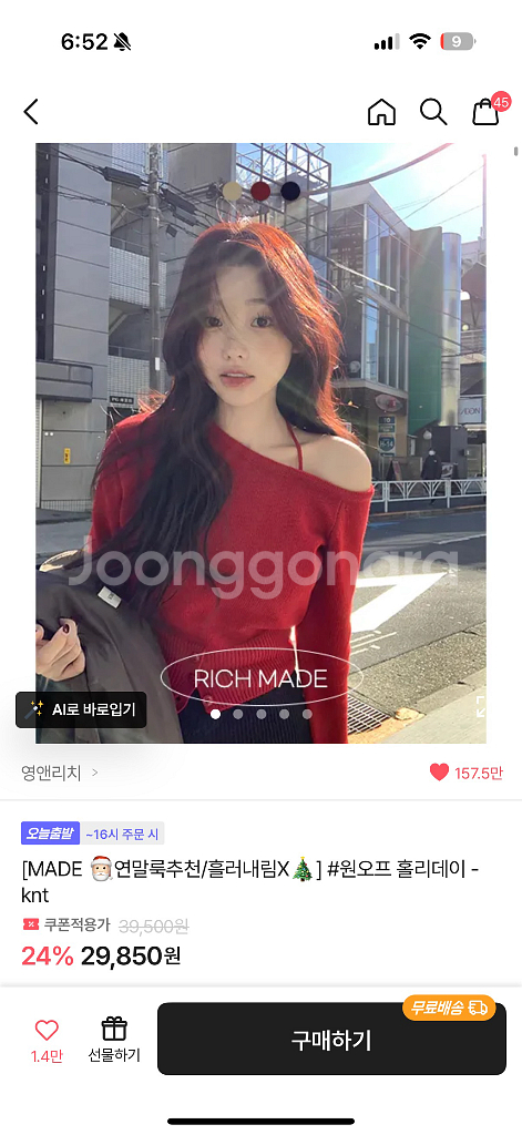 영앤리치 원오프 홀리데이 니트 원사이즈, 레드 색상 핏도 디자인도 예쁜데 조금 커서 팝니다. 1-2회 착용 별도 문의 없으시면 안전결제 진행해주세요