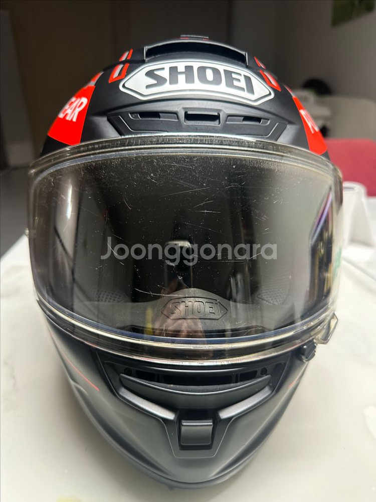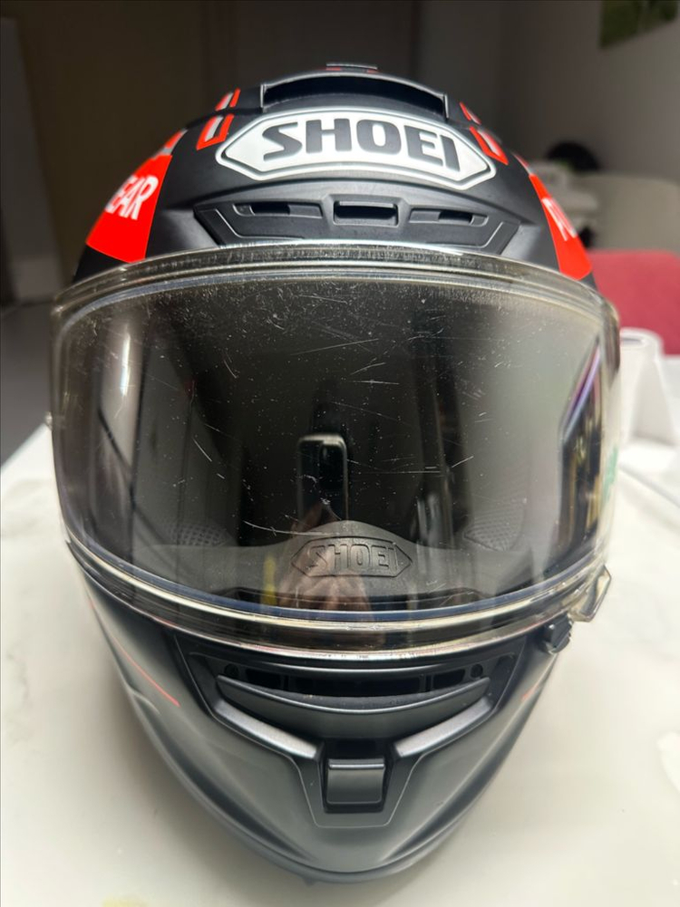 SHOEI X-14 마르케즈 무광블랙 tc1 헬멧입니다. 제 뚝배기에 부담이 큽니다. 내피세척완료하고 풀건조하고 중고구매후 1회사용했습니다. 정품 클리어쉴드+핀락 신품급 따로 있습니다. 변색쉴드 정품이고 변색 잘 됩니다. 사진상 변색쉴드 큰 기스는 바깥쪽이고. 안쪽기스는 핀락입니다. 고프로 달렸던 마운트 떼버렸고. 스티커자국이 보입니다. 내피도 사용감은 있지만 숨 죽지 않았고요. 볼패드 벗겨진거 보기싫어서 제 헬멧꺼랑 바꿔서 깨끗합니다. 사진 여러장 잘 찍었으니 확인바래요. 구성품 : 헬멧 + 순정클리어쉴드 + 파우치