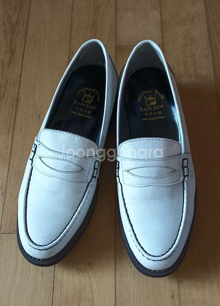 남성용 로퍼 260사이즈예요. 화이트 컬러에 브라운 창으로 깔끔하고 세련된 디자인이에요. 사용감은 있지만 아직 신을 만한 상태입니다. 레인보우 임마누엘 고급 수제화로 구입 후 행사때 한번 착용하고 보관만 해오던 신발입니다 잠실새내역 직거래 택배거래시 3000원 추가 olo4l42842o