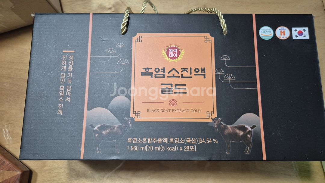흑염소진액 골드 제품이에요. 박스 상태가 깔끔하고 미개봉 새제품 같아 보여요. 건강 관리나 영양 보충용으로 좋을 것 같네요!