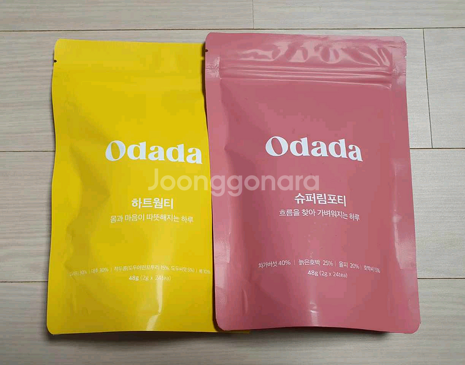 오다다 무카페인 티 2봉 세트로 판매합니다. 2g짜리 티백이 각 24개씩 들어있습니다. 웜티는 몸과 마음을 따뜻하게, 림포티는 몸을 가볍게 해줍니다. 2봉 일괄가격입니다. 2026.10까지예요. 미개봉새제품입니다. 애눌힘듭니다. 반값택배안합니다. 택비 3000원있어요.