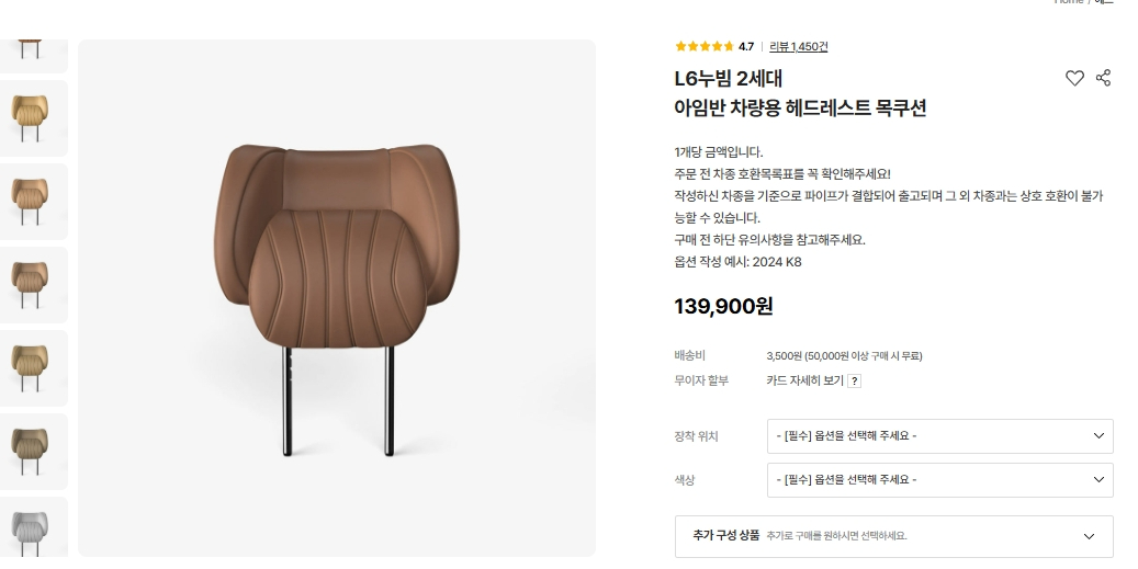 아임반 L6 누빔 2세대 차량용 헤드레스트 목쿠션 2개입니다 ●색상은 하바나 브라운 색상입니다 목쿠션이 장착된 일체형 디자인을 통해 C자 커브의 목을 정확하게 지지하여 머리까지 자연스럽게 이어지는 완벽한 편안함을 선사합니다 아임반 2열 차량용 목쿠션 L 라인 2개입니다 ●색상은 하바나 브라운 색상입니다 프리미엄 넥 쿠션 제품입니다 두제품 관리 잘한 제품이고 GV70에 장착했단 제품입니다 모두 해서 170000 원 입니다