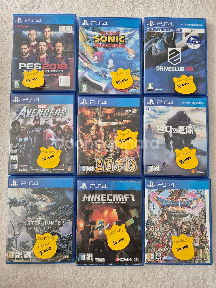 다양한 PS4 게임 타이틀들이에요. 액션 RPG, 액션 어드벤처, 슈팅 등 인기 타이틀들로 구성되어 있습니다. 중고 상품이지만 상태 양호해요 게임 타이틀 2개이상 반값택배 선불로 보내드립니다 가격조정 가격제시 가능합니다 연락 부탁드립니다~ ///////// - 위쳐 3: 와일드 헌트 - 라스트 오브 어스 파트 2 ⭕️판매완료 - 라스트 오브 어스 리마스터 ⭕️판매완료 - 완다와 거상 ⭕️판매완료 - 드래곤 퀘스트 히어로즈 - 어벤져스 ⭕️판매완료 - 어쌔신 크리드 신디케이트 - 어쌔신 크리드 오리진 - 플레이스테이션 VR 월드 - 배트맨 아캄 나이트 - 언틸 던 러쉬 오브 블러드 - 마피아 트릴로지 ⭕️판매완료 - 메탈 기어 솔리드 V: 팬텀 페인 ⭕️판매완료 - 갓 오브 워 리마스터 ⭕️판매완료 - 갓 오브 워 ⭕️판매완료 - 코드 베인 - 고스트 오브 쓰시마 ⭕️판매완료 - 디트로이트 비컴 휴먼 - 용과 같이 6 생명의 시 ⭕️판매완료 - 파 크라이 4 - 파 크라이 5 - 저지 아이즈 사신의 유언 - 언차티드 4: 해적왕과 최후의 보물 - 언차티드: 네이선 드레이크 컬렉션 - 언틸 던 - 팀 소닉 레이싱 ⭕️판매완료 - 콜 오브 듀티: WWII ⭕️판매완료 - 섬란 카구라 PEACH BEACH SPLASH ⭕️판매완료 - 마인크래프트 플레이스테이션 4 에디션⭕️판매완료 - 드라이브클럽 VR - 몬스터 헌터: 월드 ⭕️판매완료 - 진삼국무쌍 ⭕️판매완료 - PES 2018 ⭕️판매완료 -지구방위군5 ⭕️판매완료 -삼국지13