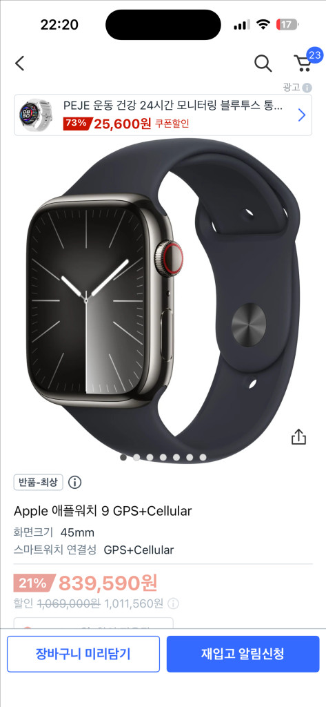애플워치 9 스테인리스(스댕) 그라파이트 색상입니다 45mm, GPS+셀룰러인데 셀룰러는 사용하지 않았습니다. Apple 보증은 2026년 1월 18일까지 남아있습니다. 배터리 성능은 100%입니다! 다른 시계를 많이 차다보니 축구할때 빼고는 거의 안차서 판매합니다. 시계 본품+ 정품 스트랩+충전기 + 풀박스로 드립니다.