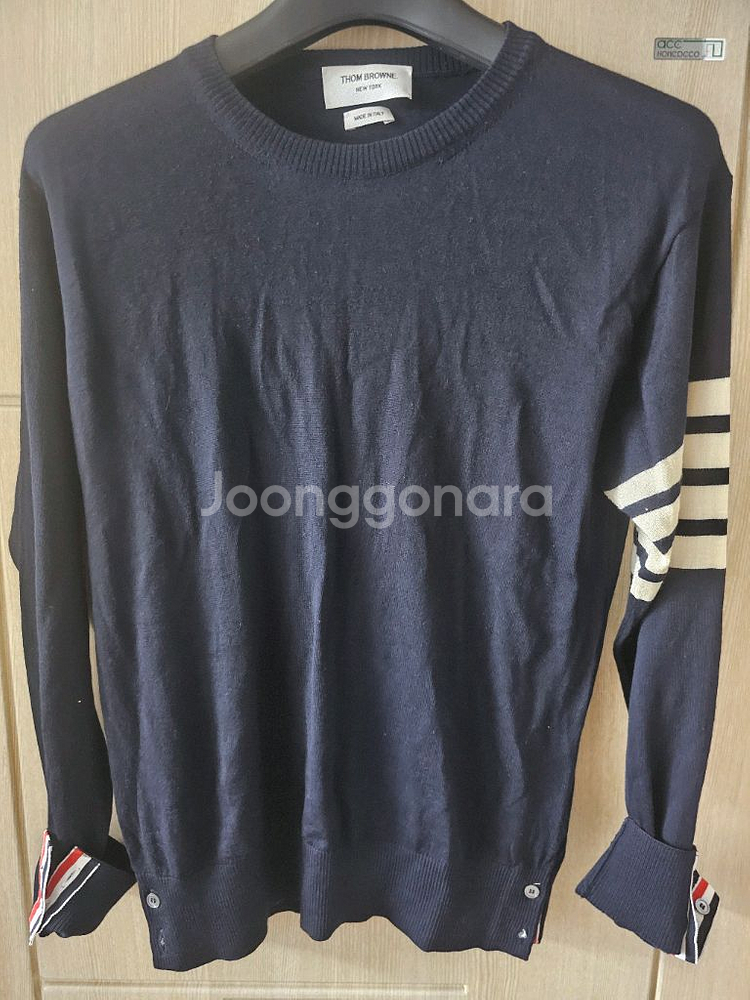 톰브라운 네이비 색상의 메리노울 니트 판매. 팔 부분 사선 시그니처 흰색 줄무늬가 포인트이며, 소매 허리부분에는 톰브라운 특유의 삼색 테이프 디테일이 있습니다 100% 울 소재로 부드럽고 편안합니다 3사이즈 황금사이즈이며 하자없고 상태좋습니다. 구김은 다림질 하시면되요. 정품입니다.