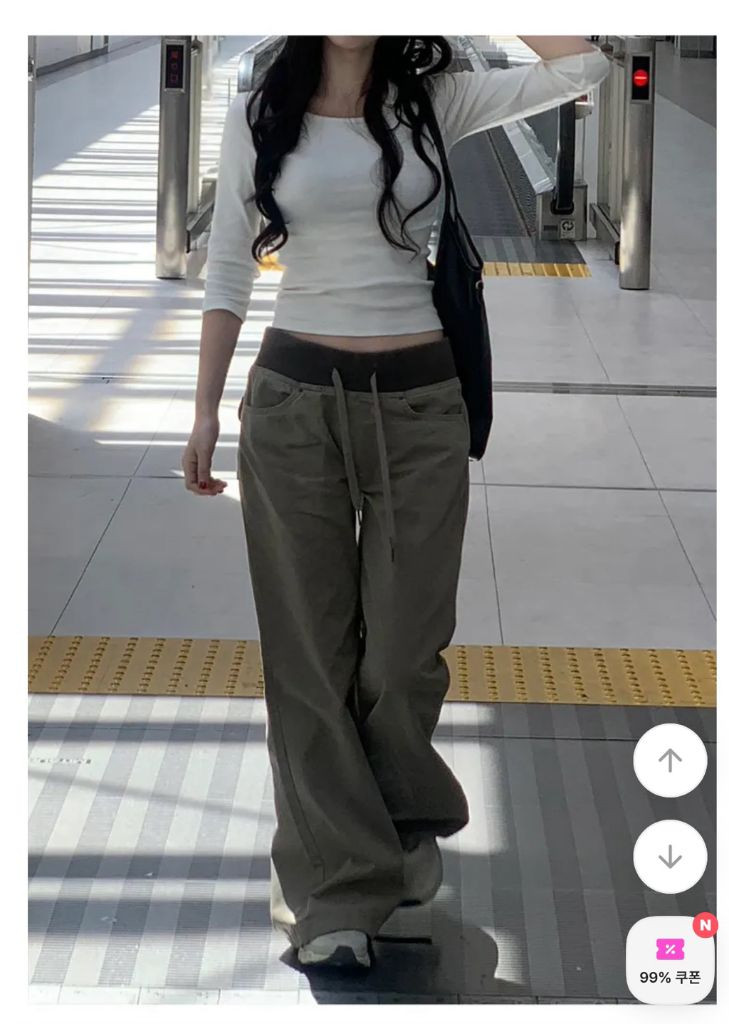 카키색 와이드 팬츠예요. 허리 밴딩으로 편안하게 착용할 수 있고, 깔끔한 실루엣이 예뻐요. 상태 양호합니다!