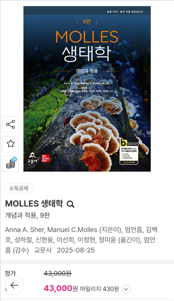 생태학 개론과 적용 9판 교재입니다. 개념과 적용을 다룬 생태학 전공서적이에요. 비닐랩핑도 그대로 있는 새책입니다. 온라인에서 정가주고 구입했는데 수업을 안듣게 되서 구입가보다 저렴하게 구입해요. 택포 하실분만 연락 주세요. 바로 입금주시고 주소 주실분만 연락 주세요:) 핸드폰 문자 연락 주세요.