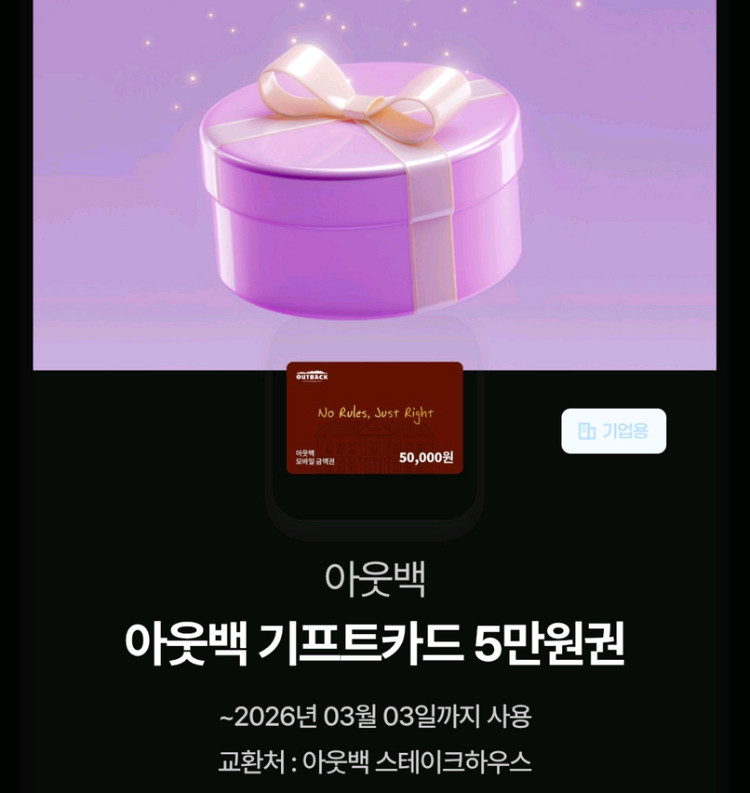 아웃백 스테이크하우스에서 사용 가능한 5만원 디지털 기프트카드예요. 2026년 3월까지 사용 가능하고 유효기간이 있으니 빠른 거래 원해요!