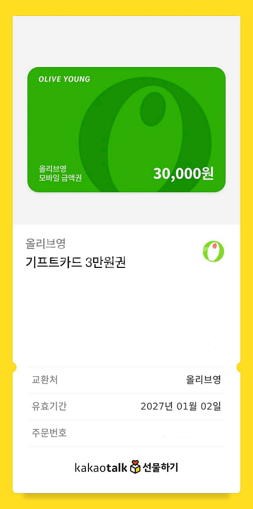 개인정보(거래정보)를 주고받는 행위는 사기에 노출될 수 있으므로 즉시 중고나라로 신고해 주세요올리브영에서 사용 가능한 3만원 기프트카드예요. 유효기간은 2027년 1월 2일까지라서 빠른 거래 원해요!
