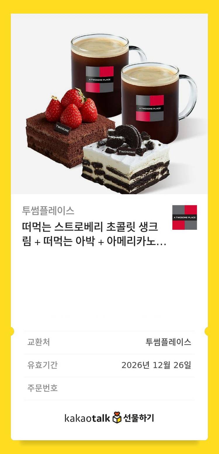 투썸플레이스 떠먹는 스트로베리 초콜릿 생크림 + 떠먹는 아박 + 아메리카노 (R) 2잔 기프티콘 문자로 전송해 드립니다. 23,400원 -> 20,000원 유효기간: 2026.12.26까지
