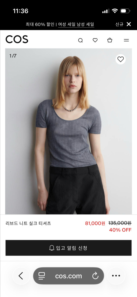 고급스러운 실크 혼방 니트 티셔츠예요. 그레이 컬러로 어떤 스타일링에도 잘 어울리고, 부드러운 소재감이 정말 좋아요.