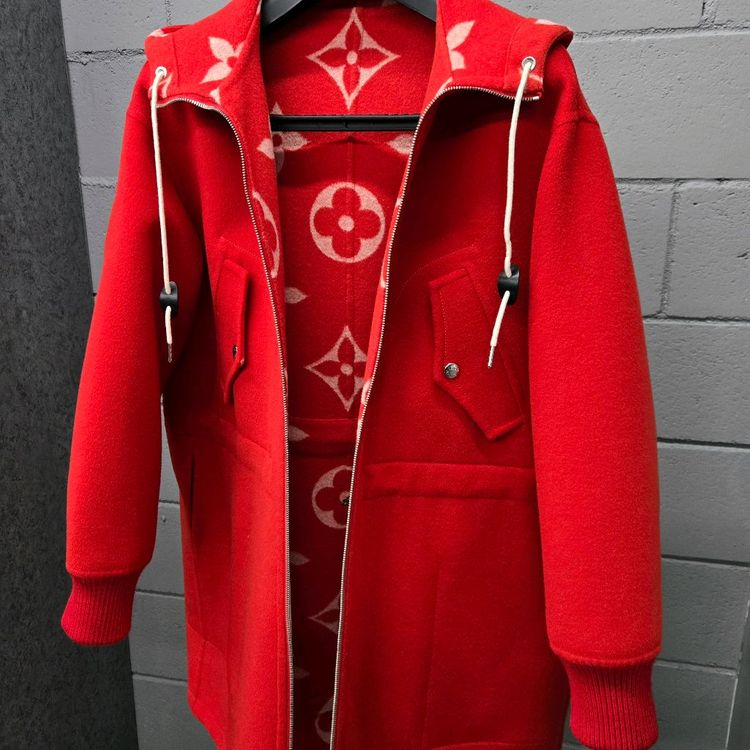 { 루이비통 LV 모노그램 리버서블 후드 코트 } 루이비통을 대표하는 LV 모노그램 패턴이 배치된 코트입니다. 리버서블 디자인으로 한쪽은 깔끔하게, 다른 한쪽은 화려하게 착용 가능합니다. 국내 백화점판 정품으로, 한글택 부착되어 있습니다. 표기사이즈보다 오버한 핏감입니다.