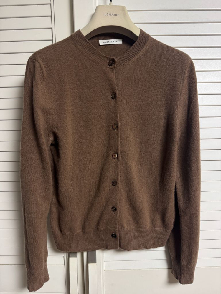 더캐시미어에서 구입한 캐시미어 100% 라운드 가디건입니다. 이탈리아에서 제조한 고급 가디건으로 캐시미어 100%라 고급스럽고 부드럽습니다. 컬러는 다크브라운 계열로 보시면 되고요. 우아하고 예쁜 색감이라 코디도 용이할겁니다. 연식 보시면 오래 되지 않은 제품인거 아실거고요. 많이 입지 않아 못입을 하자 없이 상태 좋습니다.