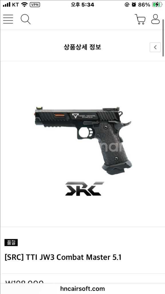 SRC TTI JW3 Combat Master 5.1 서바이벌건 판매합니다. 전체적으로 블랙 색상이며, TTI 각인이 새겨져 있습니다. 5.1인치 모델로, 크롬 도금된 아웃바렐이 장착되어 있습니다. 별도 문의 없으시면 바로 안전결제 부탁드려요!