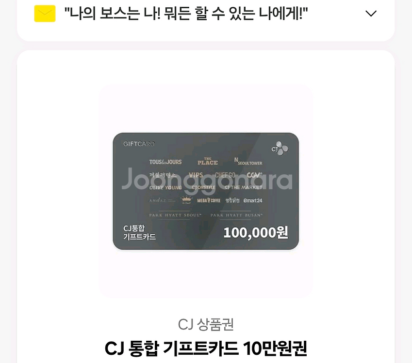 CJ 농협통합은행에서 발행하는 10만원 상당의 기프트카드예요. 음식점이나 편의점에서 사용할 수 있어서 실용적이에요.