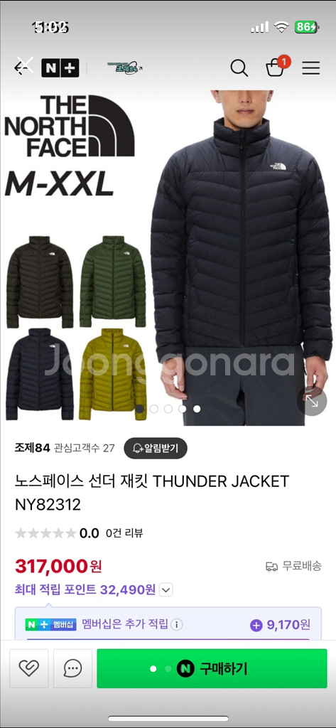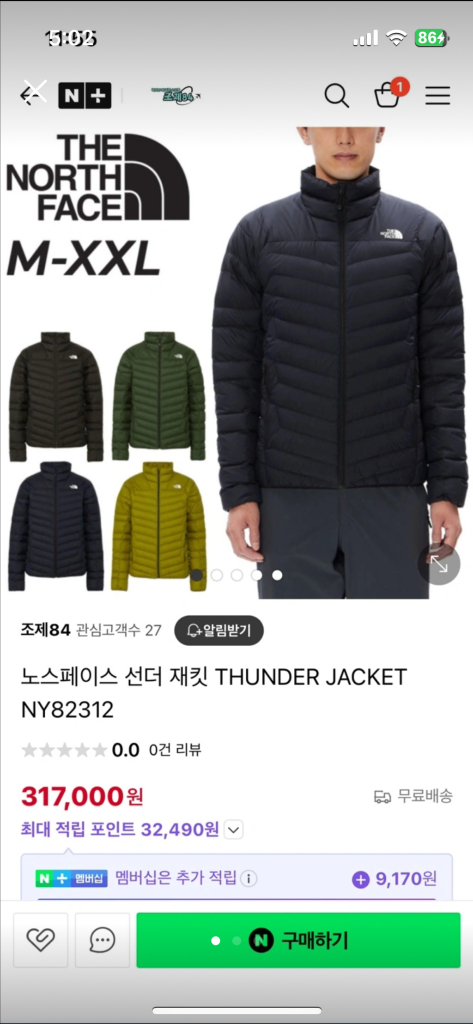노스페이스 경량패딩 썬더 재킷 M. xxl