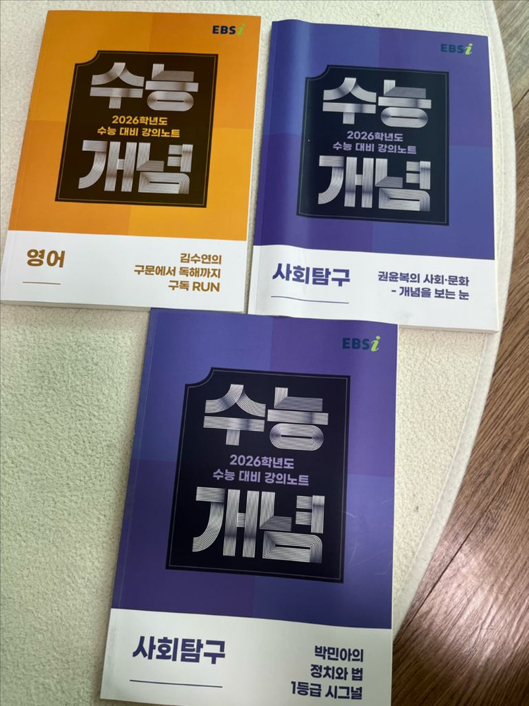 EBSi에서 나온 2026학년도 수능개념 교재 세트입니다 영어, 사회탐구 과목이 포함되어 있습니다 정치와법은 26쪽까지 필기 흔적이 조금 있습니다 (사진 참고) 나머지 두권은 새제품입니다 이름은 모두 안 써져 있습니다 cu 알뜰택배(편의점에서 수령)로 보내드립니다.