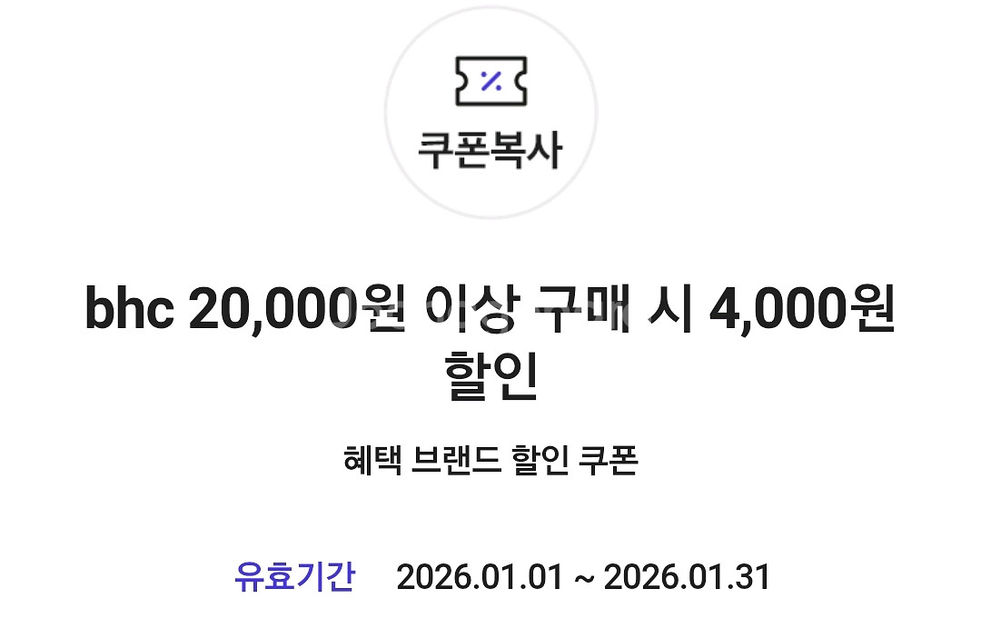 BHC 20,000원 이상 구매 시 4,000원 할인 쿠폰 유효기간 1월 31일까지