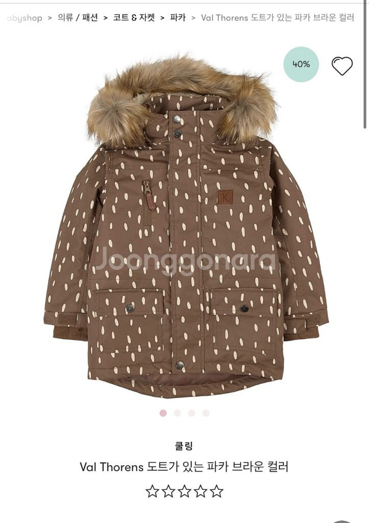 쿨링 Val Thorens 도트 파카 브라운 컬러 128사이즈입니다 보온성으로유명한 Kuling 쿨링 겨울 파카입니다 - 사이즈는 128입니다 - 겉감은 폴리에스터 100%로 되어있습니다 - 방수 기능이 있어 눈이나 비오는 날에도 걱정 없어요 - 스키복, 보드복으로 활용하기 좋아요 원가격 90유로입니다. 미착용새상품입니다. 색상은 두번째사진에 가깝습니다. 스키장가기전 직구로 샀었는데 너무 늦게받는바람에 다른거 샀어요.