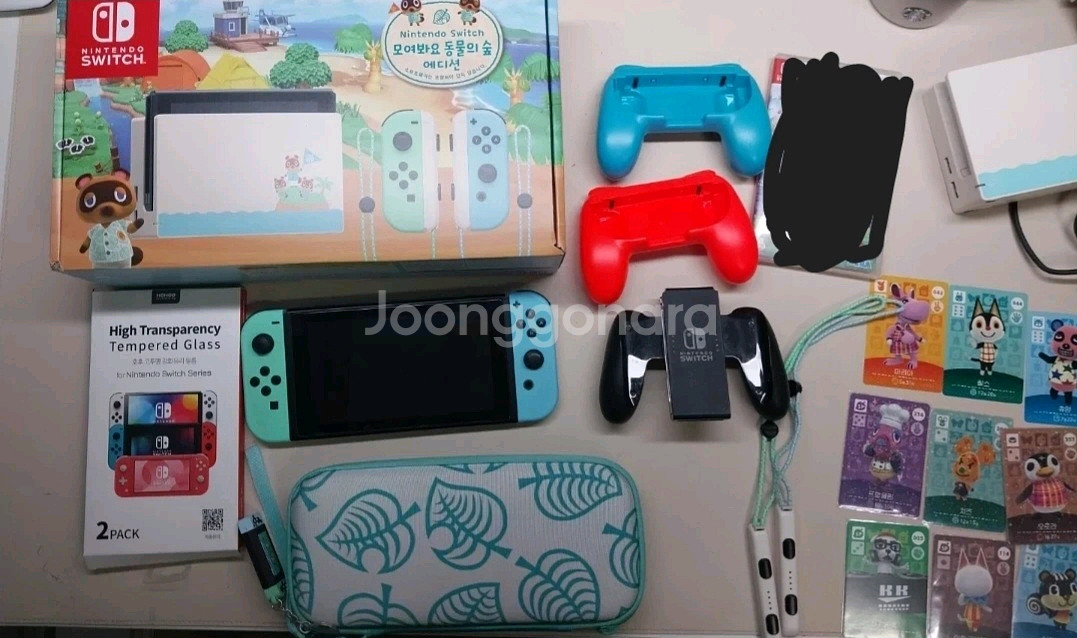 개인정보(거래정보)를 주고받는 행위는 사기에 노출될 수 있으므로 즉시 중고나라로 신고해 주세요닌텐도 스위치 동물의 숲 에디션 팝니다 상태 좋습니다 모동숲 정품 아미보 카드 11장 아미보 비품 20장 정품 박스 tv 거치 독 hdmi,케이블과 충전선 화면 보호 필름 카드 칩 보관함 컨트롤러 커버