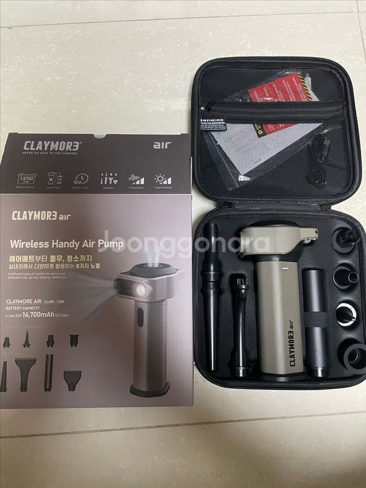 클레이모어 에어 무선 핸디 에어펌프예요. 박스와 구성품이 모두 깔끔하게 보관되어 있고, 휴대용으로 사용하기 좋은 사이즈입니다. 미사용 입니다