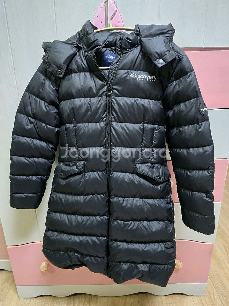 주니어 (여) 구스 롱패딩이에요. 후드가 있고 지퍼로 여닫을 수 있어서 실용적이고, 전체적으로 깔끔한 상태입니다. 택배거래 직거래 가능합니다