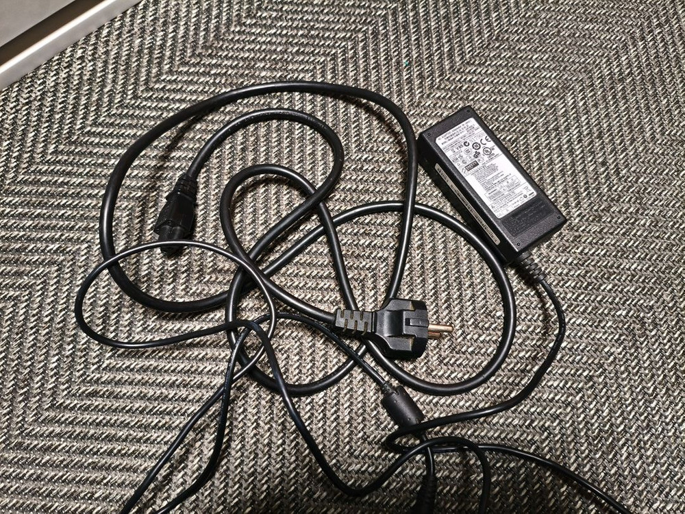 삼성 노트북용 19V 3.16A AD-6019R 어댑터 입니다 케이블에 피복 벗겨진데는 없고 눌린 자국이 조금 있으나 쓰는데는 문제 없습니다