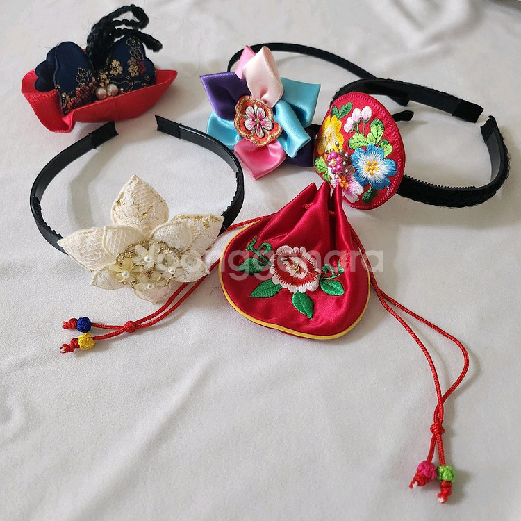 돌잔치나 명절에 착용하면 예쁜 여아 한복 액세서리 일괄입니다. 머리띠 4개, 복주머니 1개 총 5개 세트입니다. 앙증맞은 디자인으로 아이 한복 맵시를 더 살려줄 수 있습니다. 큐빅머리띠만해도 이만원가까이 주고산듯합니다. 저렴히 정리합니다.득템하세요. 환불,반품×