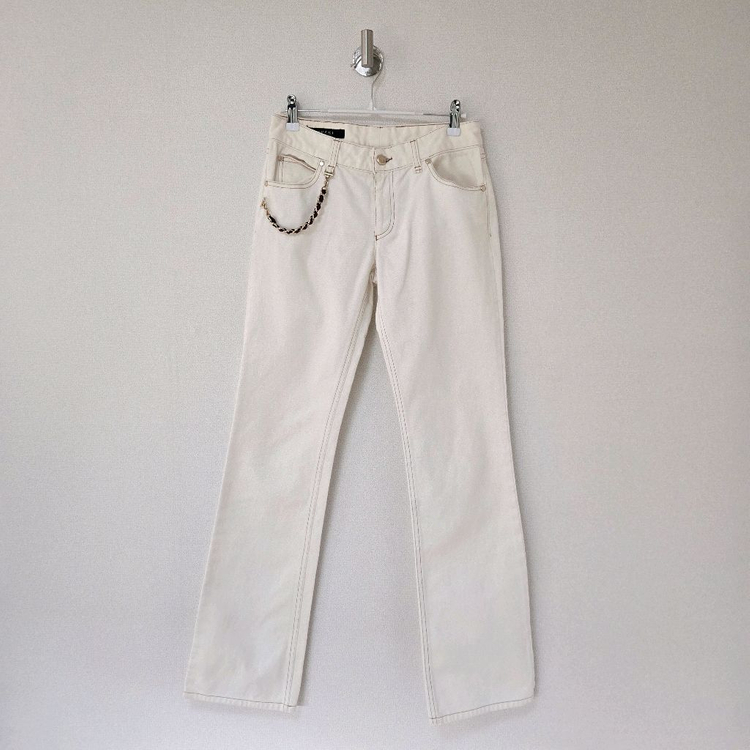 구찌 아이보리 체인 데님팬츠 / 여성 팬츠/ 여성 바지 총길이 98 허리둘레 70 허리인치 27.5 소재 Cotton 100 표기사이즈 38 0437