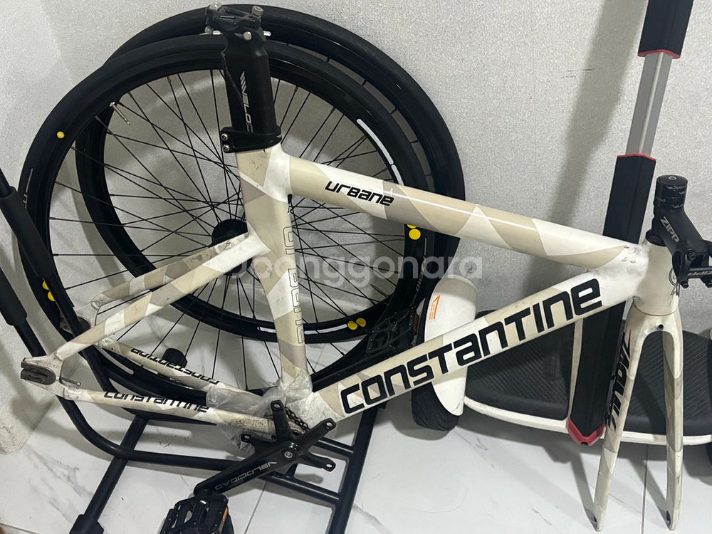 콘스탄틴 브랜드의 화이트 컬러 자전거 프레임입니다. 사용감은 있지만 전체적으로 양호한 상태예요. 자전거 조립용으로 좋을 것 같습니다 스템 짚 서비스코스 크랭크 순정