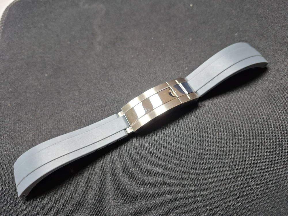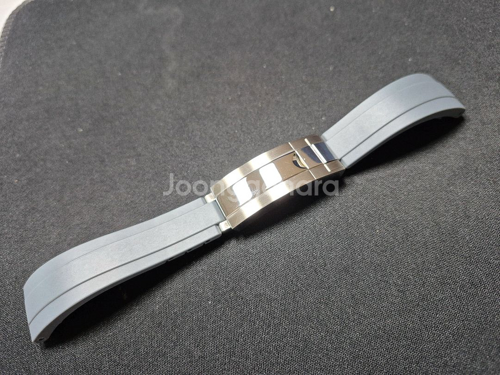 20mm 러그용 그레이 러버밴드 스트랩 슬라이딩 조절식 더블락 버클 고급스러운 디자인의 시계 러버 밴드 스트랩입니다. 은색 버클과 회색 러버의 조화가 돋보입니다. 러그20mm용이며 롤렉스 서브마리너 등 스포츠와치 범용입니다 땀에도 강해서 관리가 용이합니다.