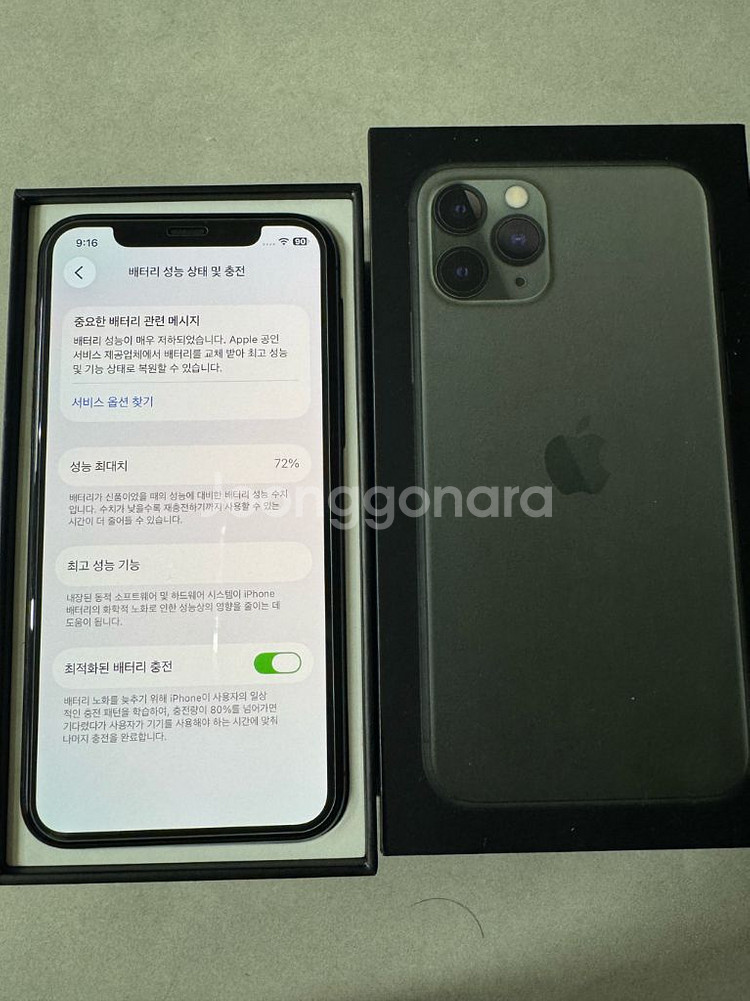 개인정보(거래정보)를 주고받는 행위는 사기에 노출될 수 있으므로 즉시 중고나라로 신고해 주세요모델명아이폰 11 프로 256GB컬러미드나이트 그린모든기능 정상작동 수리이력 없음 풀커버&케이스 항상 착용하여 상태 매우 좋습니다 서울 동대문구 직거래